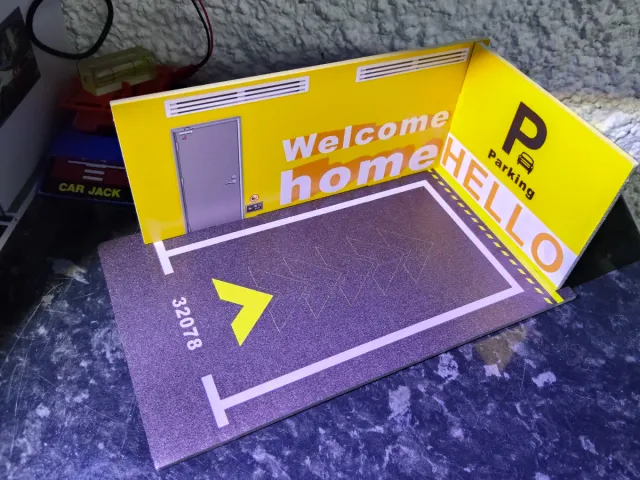 Garagem em miniatura, ideal para carros de escala 1/32. - Design de estacionamento com marcações. - Painel decorativo com Welcome home e HELLO Parking.