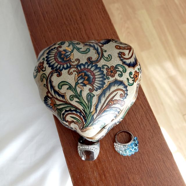 Detalhes do produtoGuarda jóias fabrico Português pintado à mão. Com desenho floral e tracos de cor dourada