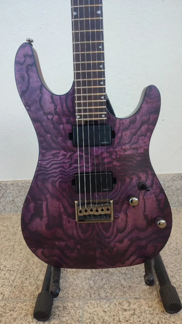 Detalhes do produtoGuitarra elétrica Cort KX500 com um acabamento roxo deslumbrante. Em perfeito estado, apenas com danos na madeira como se vê na última foto, porque caiu da caixa. Pickups Fishman Fluence Modern com push/pull para coil split. Setup feito e cordas novas trocadas à pouco tempo.