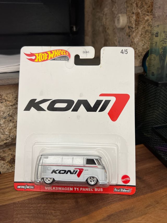 Miniatura Hot Wheels Premium do Volkswagen T1 Panel Bus com tema Koni. - Escala 1/5. - Detalhes em Metal/Metal. - Rodas Real Riders.