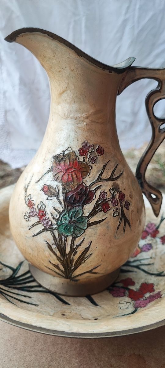 Detalhes do produtoConjunto de jarra e prato em bronze com um belo design floral.