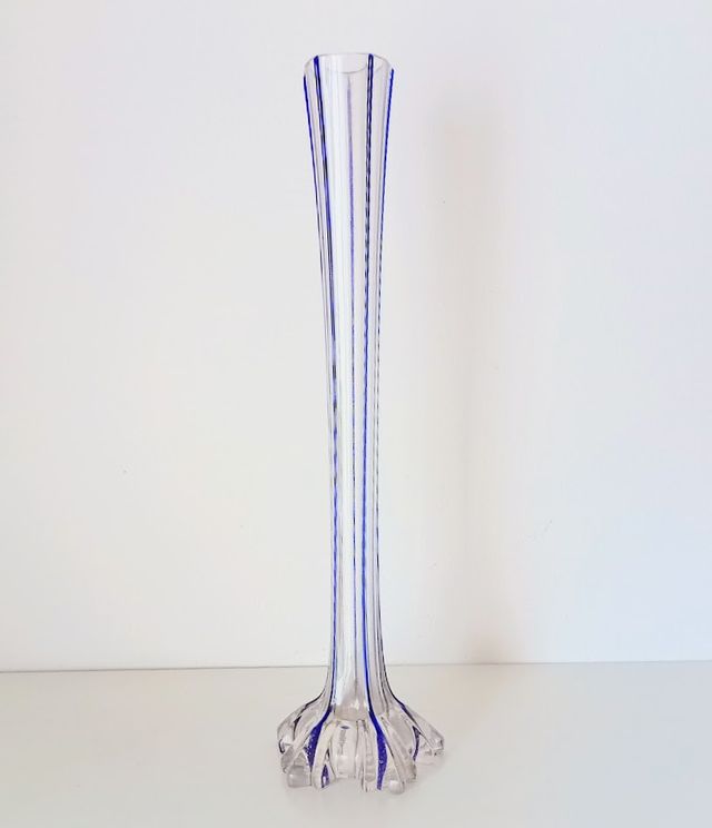 Detalhes do produtoJarra fina em vidro translúcido com fios azuis, com base recortada em forma de pétala. Em estado seminovo.