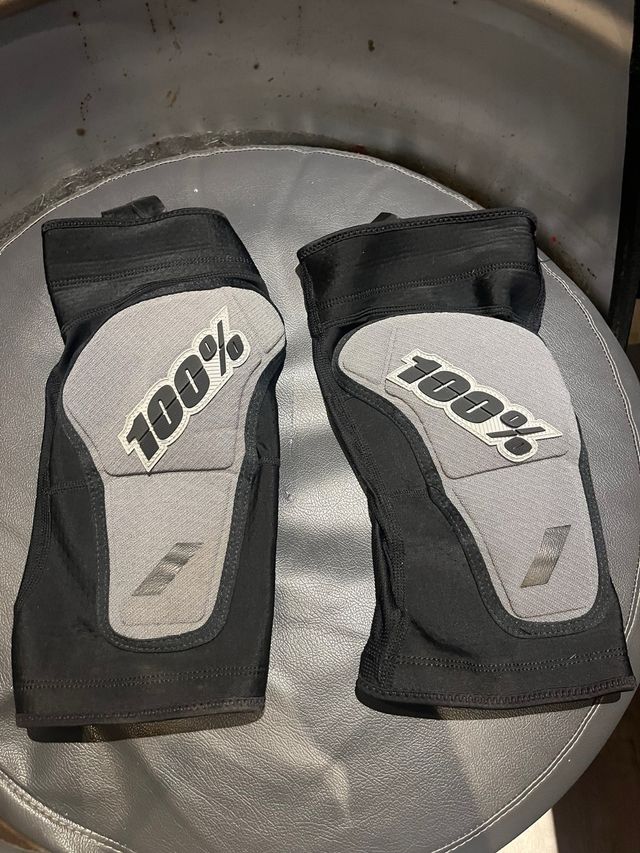 Joelheiras da marca 100% em preto e cinza. - Design acolchoado para proteção. - Tecido respirável. - Logotipo 100% visível. tamanho L