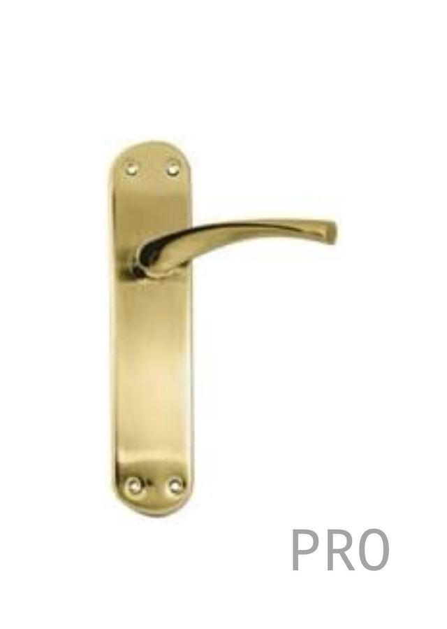 Detalhes do produtoMICEL - 07078 - Conjunto de maçanetas com chapa larga de aço e puxador em alumínio, acabamento em latão acetinado, cor ouro, 280 x 145 x 70 mm