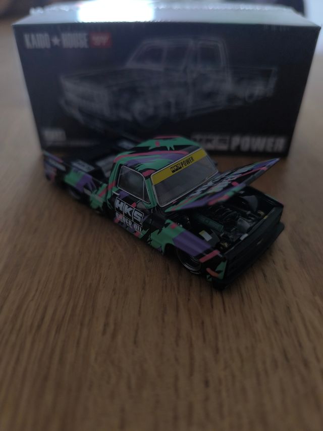 Miniatura de colecionador Kaido House Silverado HKS V1. - Design exclusivo com padrão camuflado. - Detalhes HKS Power. - Capô abre.