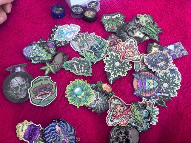 - Inclui elementos como caveiras, alienígenas e símbolos de cannabis.