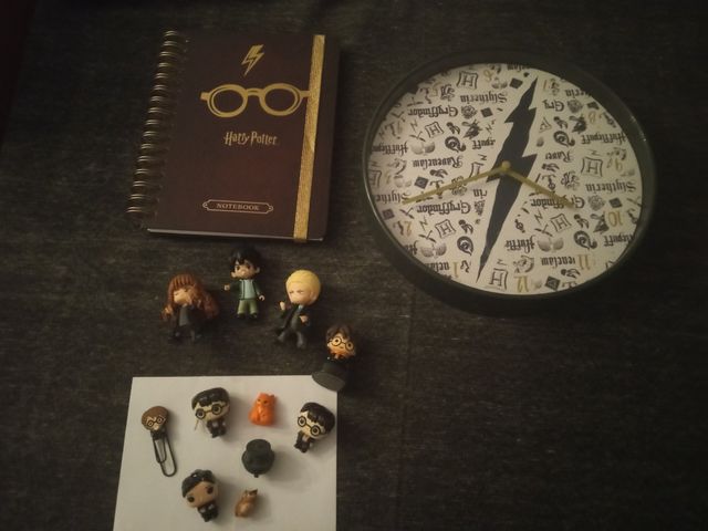 Detalhes do produtoConjunto de artigos temáticos de Harry Potter usados. Inclui um caderno, um relógio de parede e várias figuras. Os itens apresentam-se em bom estado.