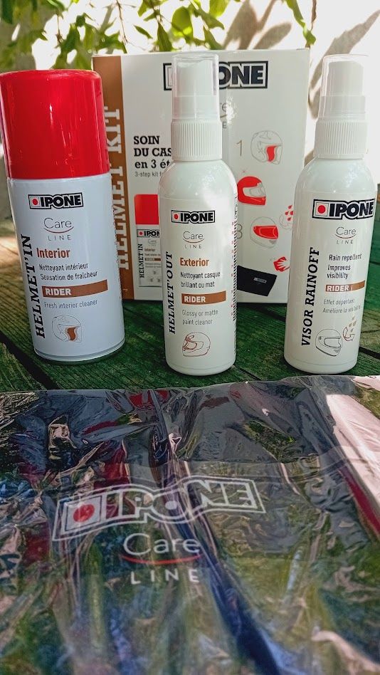Detalhes do produtoKit de limpeza para capacetes da marca IPONE, com produtos para interior, exterior e viseira.
