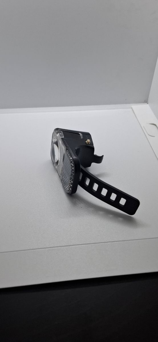 Lanterna de bicicleta preta com alça de fixação. - Design compacto e leve. - Alça ajustável para diferentes tamanhos de guidão ou canote.