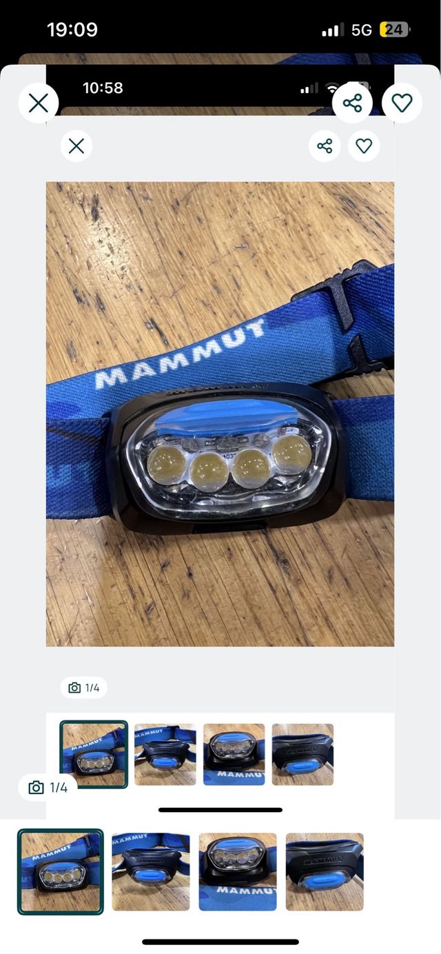 Lanterna de cabeça Mammut T-Trail com design moderno. - Tira ajustável para conforto. - Lentes claras para iluminação. - Marca Mammut visível na tira.