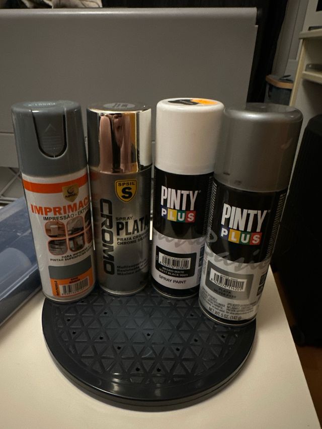 Conjunto de latas de spray para pintura nuevas - Lata de imprimación. - Lata de Cromo. - Lata de Prata. - Lata de Negro Mate.