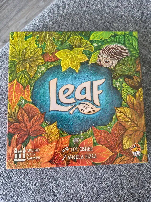 Detalhes do produtoJogo de tabuleiro Leaf, com arte temática de outono e um ouriço, versão francesa.