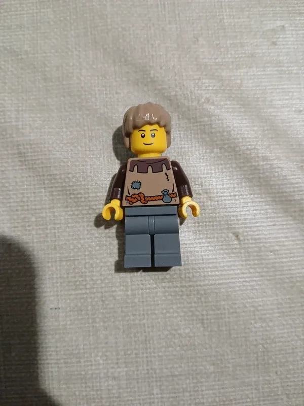 Figura de Lego de un joven campesino. - Cabeza amarilla con expresión sonriente. - Pelo castaño. - Torso con estampado de camisa marrón y delantal. - Piernas grises.