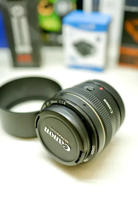 Lente fixa que permite uma grande abertura, Com abertura de 1.4 ideal para retratos com fundos desfocados com um bokeh lindissimo - Inclui para-sol