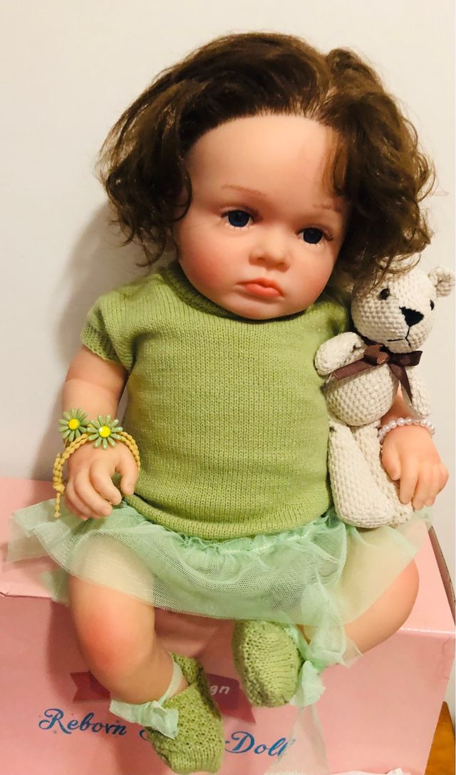 Linda boneca estilo reborn, com detalhes realistas. - Cabelo castanho. - Olhos azuis. - Roupa verde com saia de tule. - Inclui ursinho de pelúcia e pulseiras.