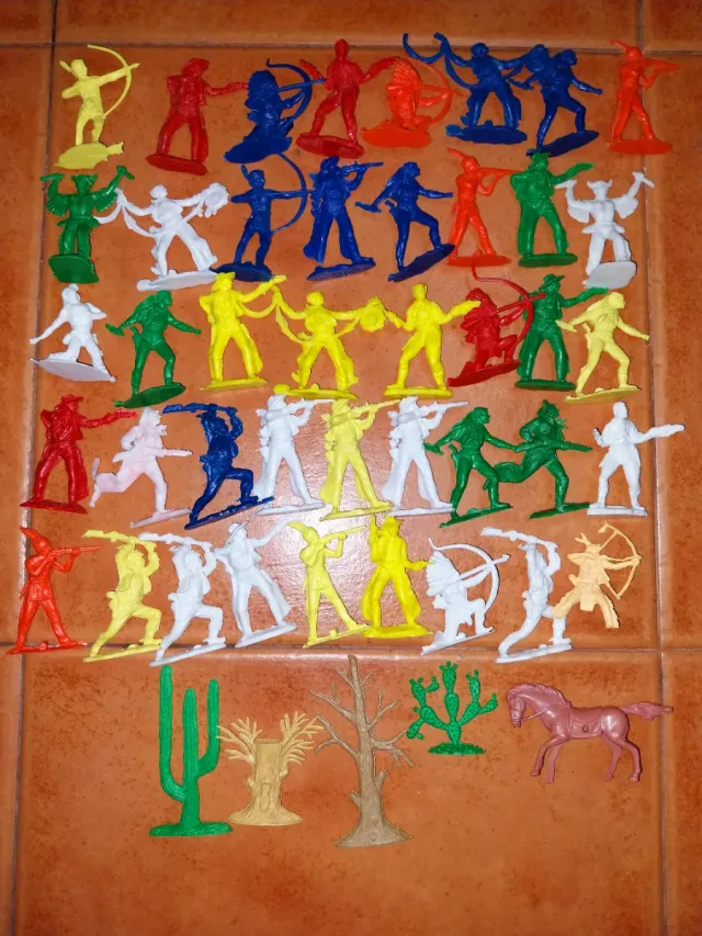Vendo brinquedo antigo, lote composto por 48 bonecos ou figuras antigas em plástico Índios, Cowboys e acessórios. Preço do conjunto - 30€