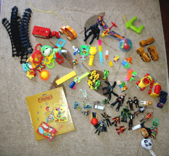 Pequenos brinquedos como: livros, pista de comboio, brinquedos de bebé, carrinhos, avião, Batman, bowling... Livro "Histórias de Embalar" da Cerelac
