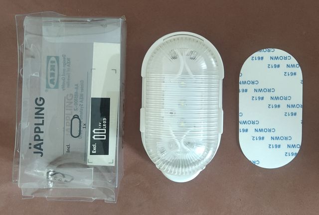 Detalhes do produtoCaixas de luz com 3 leds para armários ou espaço interiores (modelo Jappling da Ikea ). Têm um botão que se activa ao abrir ou fechar as portas. Fácil instalação; Funciona com 2 pilhas AAA.