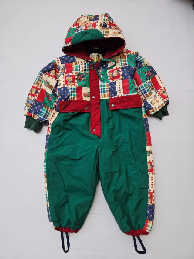 Detalhes do produtoMacacão de neve vintage infantil com um divertido padrão de ursinhos e xadrez.