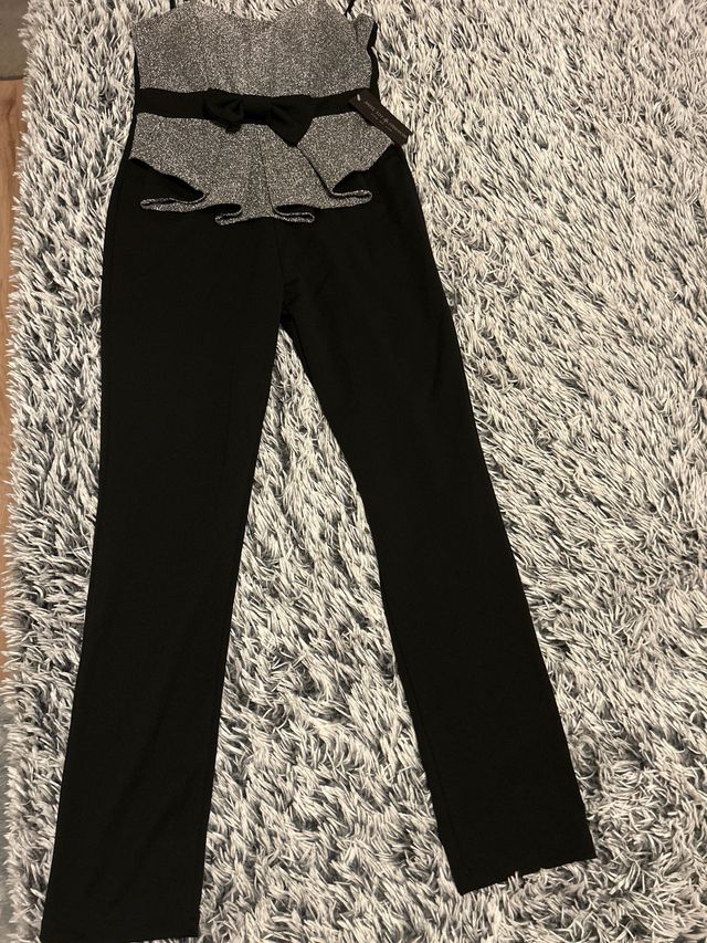 Detalhes do produtoMacacão elegante com top em lantejoulas prateadas e calças pretas.