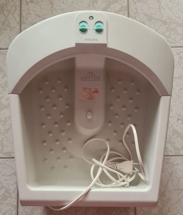 Máquina de massagem para pés da marca Philips, modelo Body Care. - Controlo de temperatura a 37°C. - Dois botões de controlo. - Design branco.