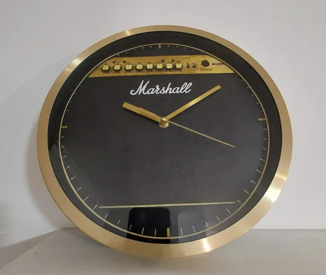 Relógio de parede com design inspirado em amplificador Marshall. - Moldura dourada Com 29 cm de diâmetro - Mostrador preto com detalhes. - Logo Marshall em destaque.