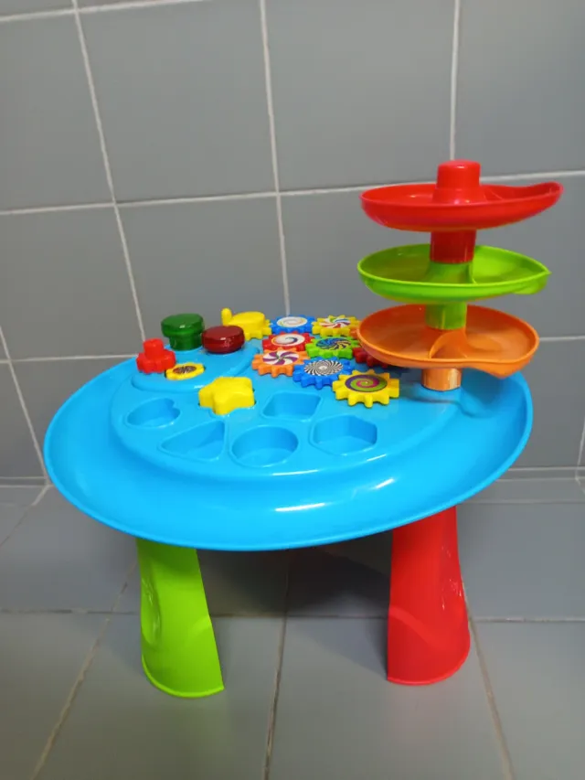 Detalhes do produtoMesa de atividades com diversos elementos para entreter os pequenos. Possui uma torre para bolas e engrenagens coloridas.