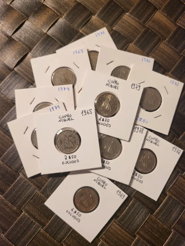 Conjunto de 12 moedas de 2$50 Escudos em Cupro Níquel. - Moedas de diferentes anos. - Material: Cupro Níquel. - Valor facial: 2$50 Escudos.