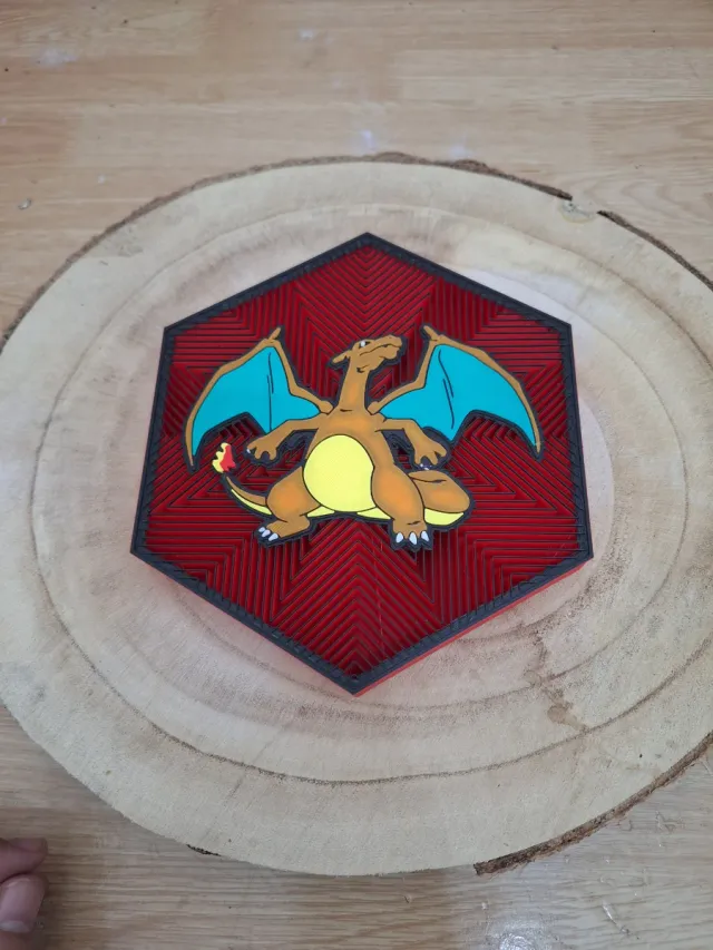Moldura decorativa com a imagem do Charizard, Pokémon. - Design hexagonal com camadas. - Detalhes em vermelho e preto. - Figura do Charizard em destaque.