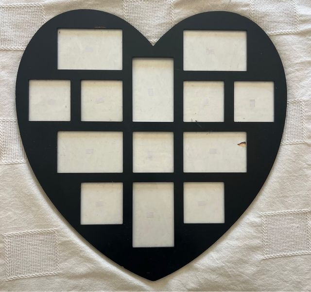 Detalhes do produtoQuadro decorativo em formato de coração para fotografias. Em madeira, na cor preta, com pequenas imperfeições. Ideal para decoração e recordações! - Moldura em formato de coração. - Espaço para fotos. - Cor preta. - Material: madeira.