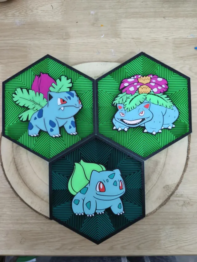 Conjunto de molduras decorativas com os Pokémon Bulbasaur, Ivysaur e Venusaur. - Design hexagonal. - Cores vibrantes. - Ideal para fãs de Pokémon.