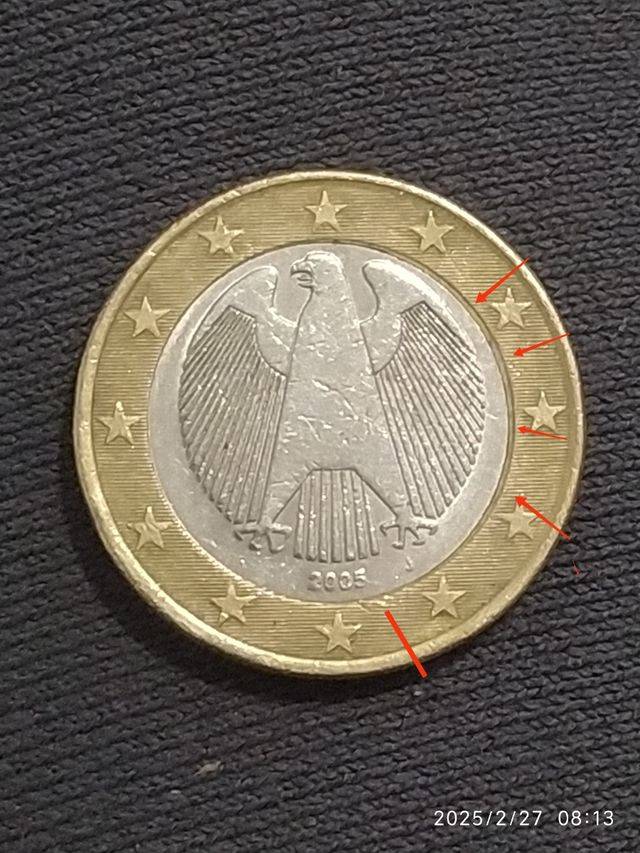 Dos Monera de hermana de un euro con pequeño defecto en la parte derecha se ve en la flecha una 2005 y la otra 2002.