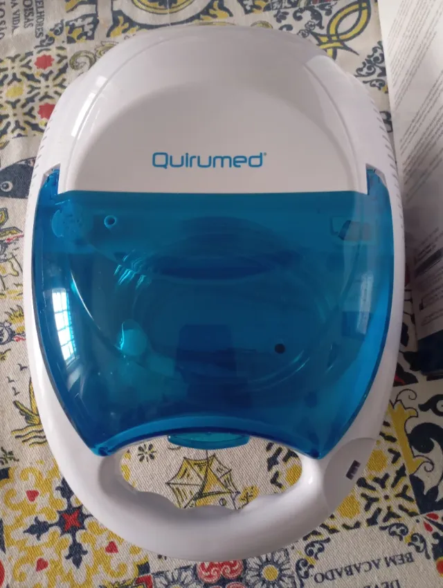 Detalhes do produtoNebulizador de compressor da marca Quirumed, modelo 347-CN0. Apresenta um design moderno com acabamento branco e detalhes em azul.