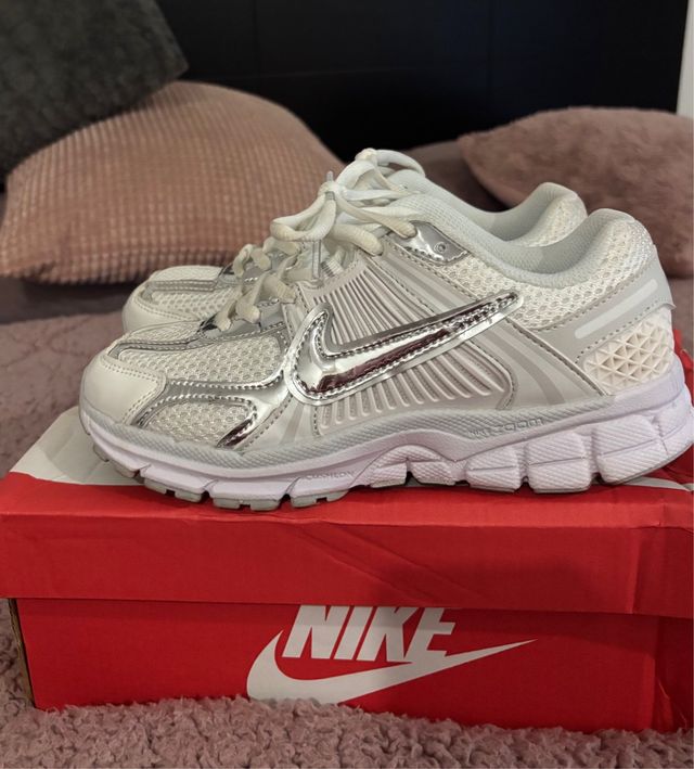 Detalhes do produtoTênis Nike Zoom Vomero em branco com detalhes prateados.