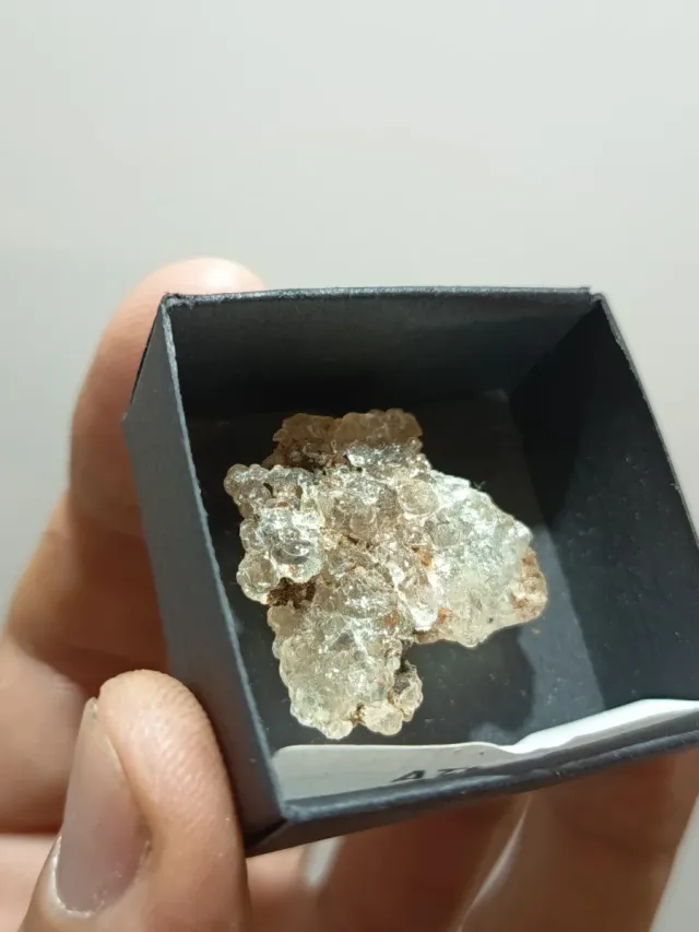 Mineral de opala Hyalite em sua caixa 4x4 com reação a luz UV. - Cristais translúcidos. - Cor verde quando induzida luz UV
