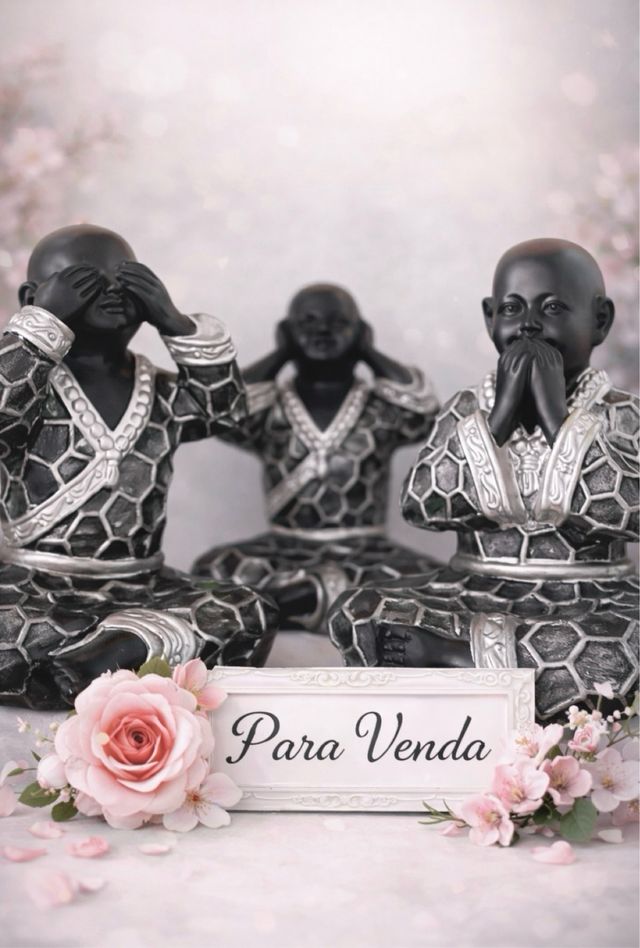 Conjunto decorativo dos Três Sábios em louça. - Peças com acabamento em preto e detalhes prateados. - Representam não ver, não ouvir e não falar.