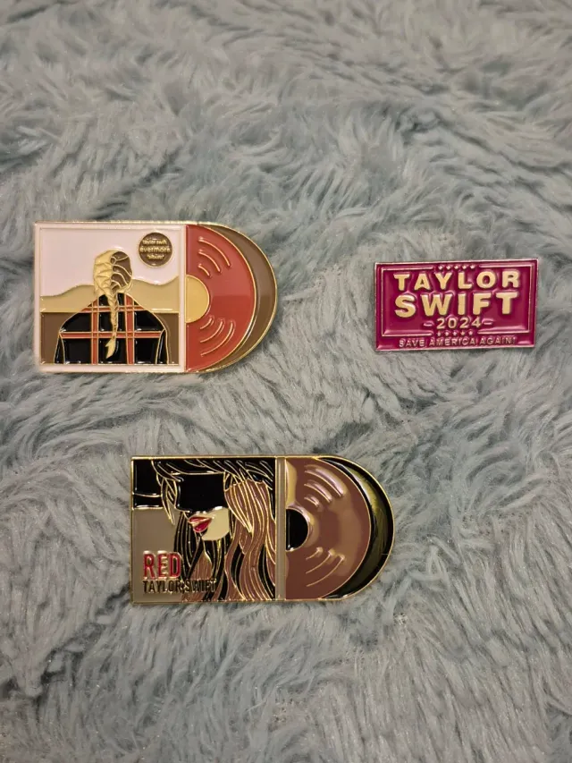 Conjunto de pins colecionáveis da Taylor Swift. - Pin com arte inspirada em Folklore. - Pin Red Taylor's Version. - Pin Taylor Swift 2024 Save America Again.