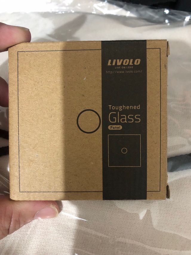 Painel de vidro temperado da marca Livolo. - Material: Vidro temperado. - Acabamento: Painel. - Design: Círculo e quadrado com círculo central.