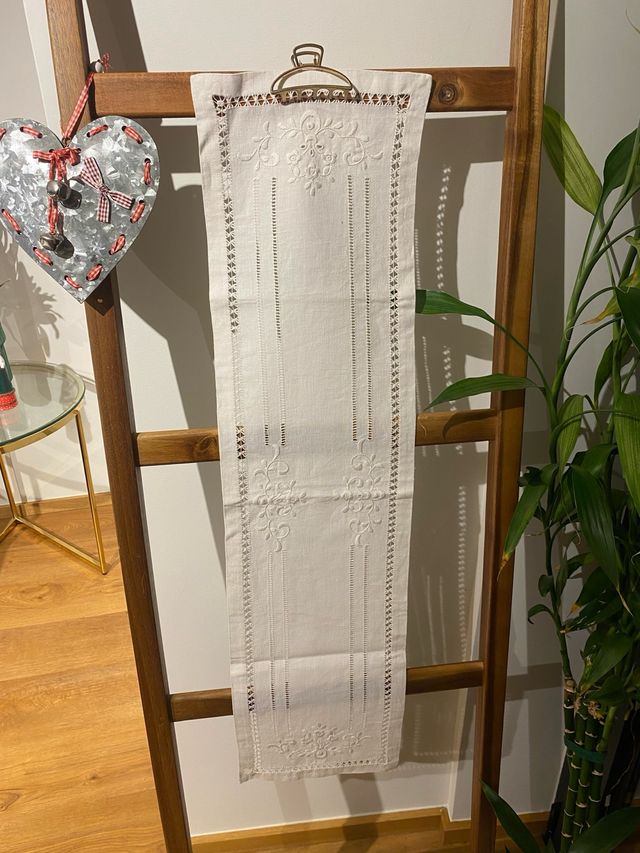 Paninho de tecido com bordados delicados. Bainha aberta - Bordado floral. - Acabamento com pontos decorativos nas bordas. Não tenho a certeza se é linho ou algodão