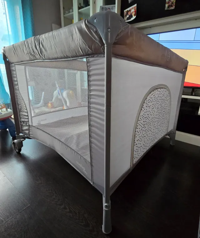 Parque infantil em tons de cinza e branco, com laterais em rede e um padrão decorativo. - Laterais em rede para ventilação. - Abertura numa lateral - Estrutura em metal. - Rodas para fácil mobilidade.
