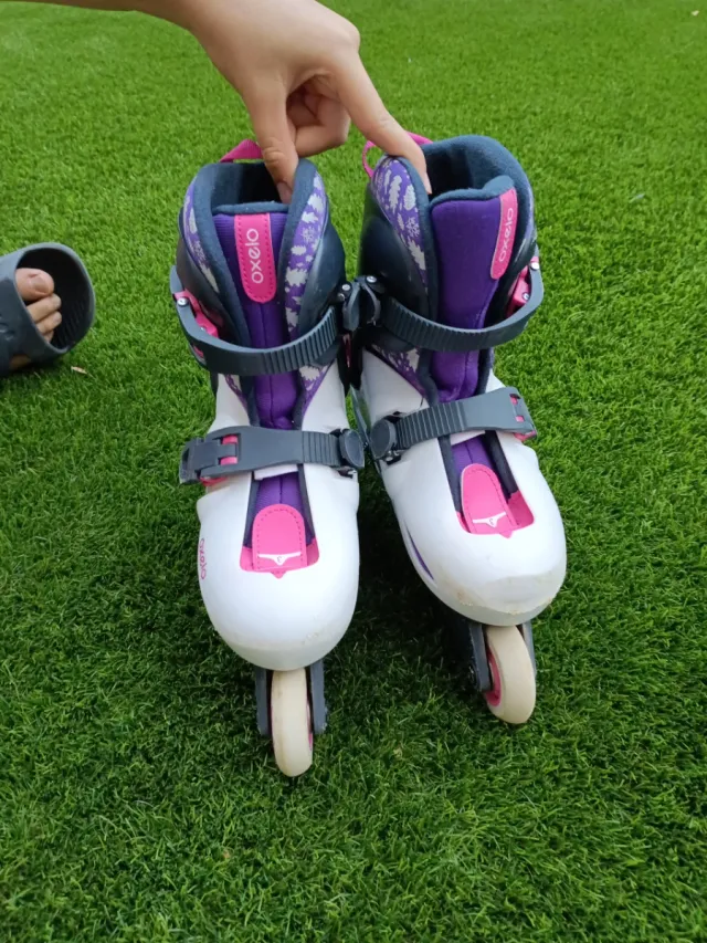 Detalhes do produtoPatins em linha Oxelo ajustáveis para os tamanhos 32 a 34.