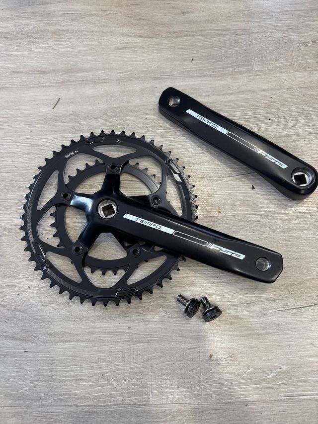 Detalhes do produtoPedaleiro FSA Tempo em preto, com pratos 50/34 dentes. Inclui os dois braços do pedaleiro e parafusos.
