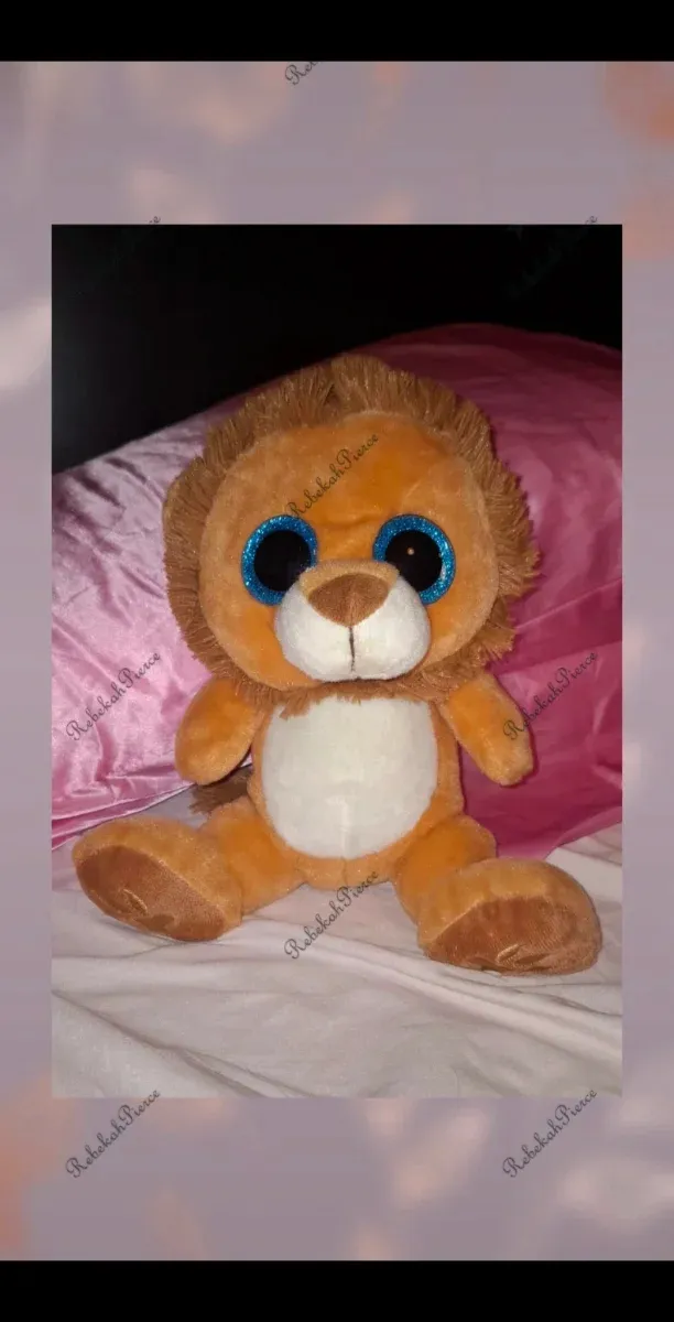 Detalhes do produtoPeluche de leão com olhos grandes e brilhantes.