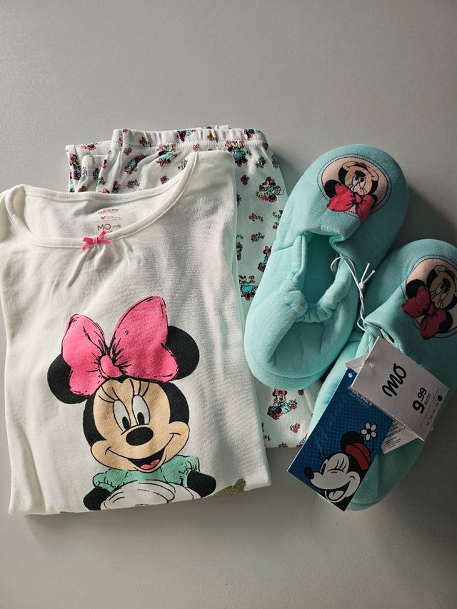 Detalhes do produtoConjunto de pijama com pantufas, completamente novo, sem usar, da marca MO, decorado com a Minnie. O pijama é tamanho 13/14 anos e as pantufas são o tamanho 35/36. As pantufas mantêm a etiqueta. As fotografias também fazem parte da descrição.