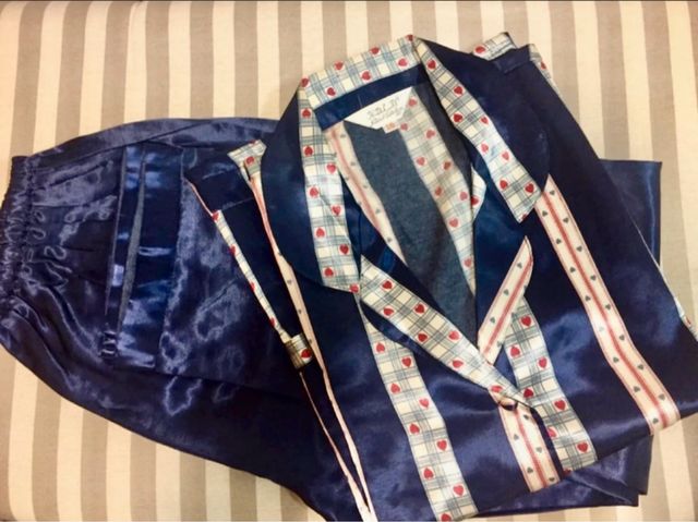 Pijama de rapaz de duas peças, calças e manga comprida. Tecido acetinado azul e interior cardado. Marcado com tamanho 16 mas veste pequeno tamanho 10.