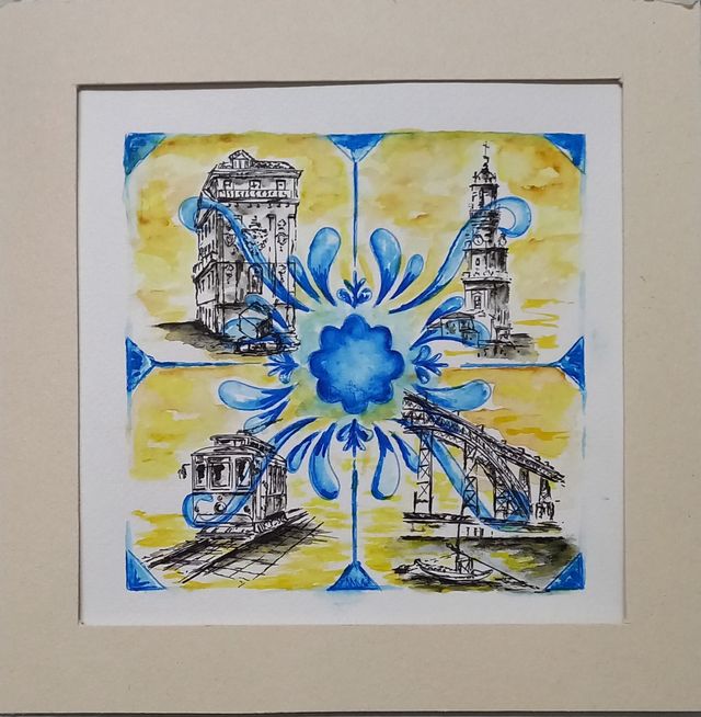 Detalhes do produtoPintura original em aguarela com motivos de azulejo do Porto. Uma peça única que retrata a cidade.