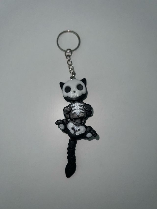 Porta-chaves com design de gato esqueleto. - Detalhes em preto e branco. - Corrente e argola para chaves.