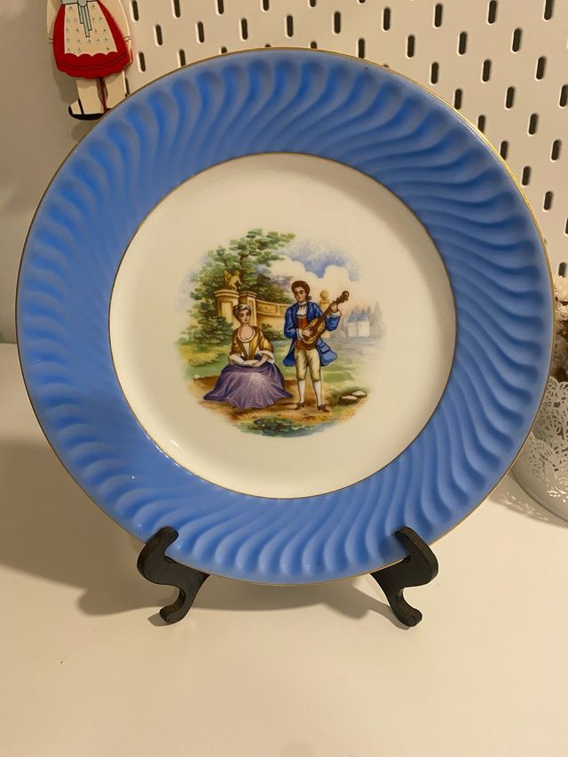 Prato decorativo vintage da Vista Alegre, com uma cena campestre pintada. - Borda azul com relevo. - Detalhe dourado na borda. - Pintura de casal em cenário histórico.