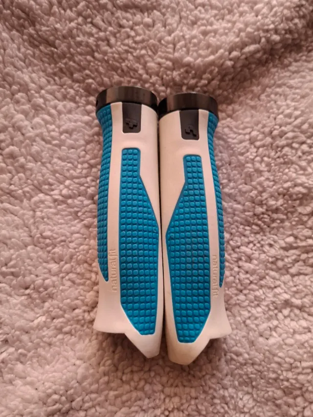 Punhos de bicicleta da marca Naturalfit. - Cor branca e azul. - Design ergonómico. - Textura antiderrapante.