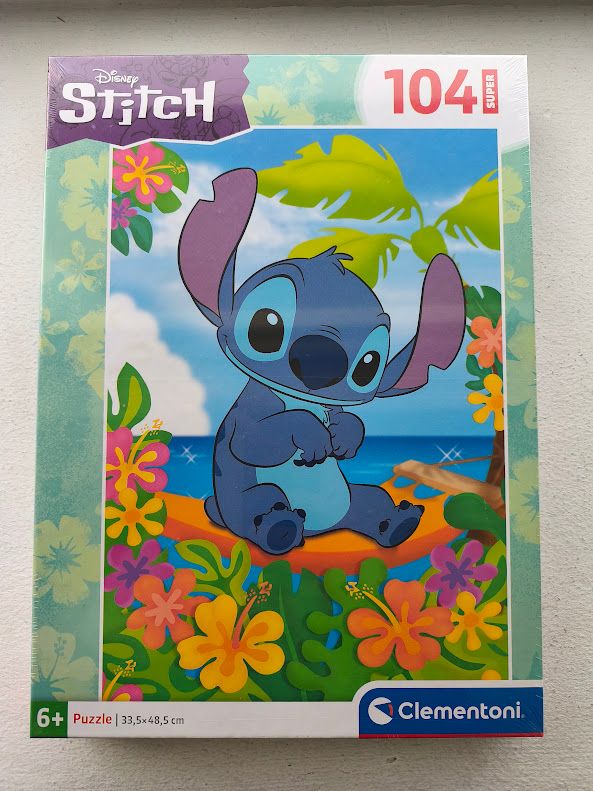 Puzzle Clementoni com o Stitch num cenário tropical. Ideal para fãs do personagem. - 104 peças - Dimensões: 33,5 x 48,5 cm - Idade recomendada: 6+